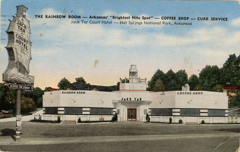 View of the Jack Tar Rainbow Room and coffee shop in Hot Springs, Arkansas. Sign for Jack Tar Court Hotel on left. Printed on front: "The Rainbow Room, Arkansas' brightest nite spot. Coffee shop. Curb service. Jack Tar Court Hotel. Hot Springs National Park, Arkansas." Printed on back: "Watch for the sign of 'ship-shape-service' Arkansas' distinctly different restaurant offering only the finest servce and cuisine. Jack Tar Court Hotel in connection a liquor store, fountain, drug sundrie counter, and news stand. Curb service. May I take this opportunity to extend you a very cordial invitation to visit us here at the Jack Tar Court Hotel, the new stream-lined version of the 'Hotel of Tomorrow,' where we offer all the services and appointments of the finest resort hotel, yet the comforts and informal privacy of one's own home. In addition to telephone, maid, twenty-four hour mail, food, ad drink service and other regular facilities of the modern hotel, we offer luxuriously appointed one, two and three room apartments, complete with circulating ice water, cooled and heated by individually controlled air-conditioning units. Indirect lighting and large roomy closets give other features not found in the average hotel accommodations. May I again urge you to pay us a visit on your next trip to Hot Springs and let you see for yourself that it is truly a home away from home. Yours very truly, Vance Bryan, manager. Natural color postcard made in U.S.A. by E.C. Kropp Co., Milwaukee, Wis. (BAY)." Card is postmarked December 17, 1945.