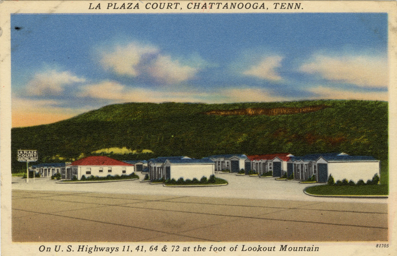 View of the La Plaza Court in Chattanooga, Tennessee. Printed on front: "La Plaza Court, Chattanooga, Tenn. On U.S. Highways 11, 4, 64 & 72 at the foot of Lookout Mountain." Printed on back: "Ten minutes drive from downtown Chattanooga. On U.S. Highways 11, 4, 64 & 72 at the foot of Lookout Mountain. Tile baths, electric heat, air-conditioned, 18 single and double units. La Plaza Court, Route No. 4. Chattanooga, Tenn. AAA. Published only by W.M. Cline Co., Chattanooga, Tennessee."