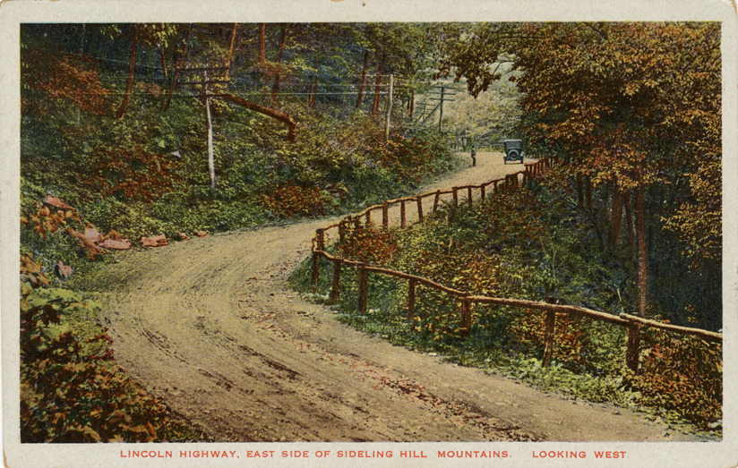 Distant view of a car traveling on the Lincoln Highway at Sideling Hill. Printed on front: "Lincoln Highway, east side of Sideling Hill mountains, looking west." Printed on back: "Pub. by Wm. A. Weisel Co., Bedford, Pa."