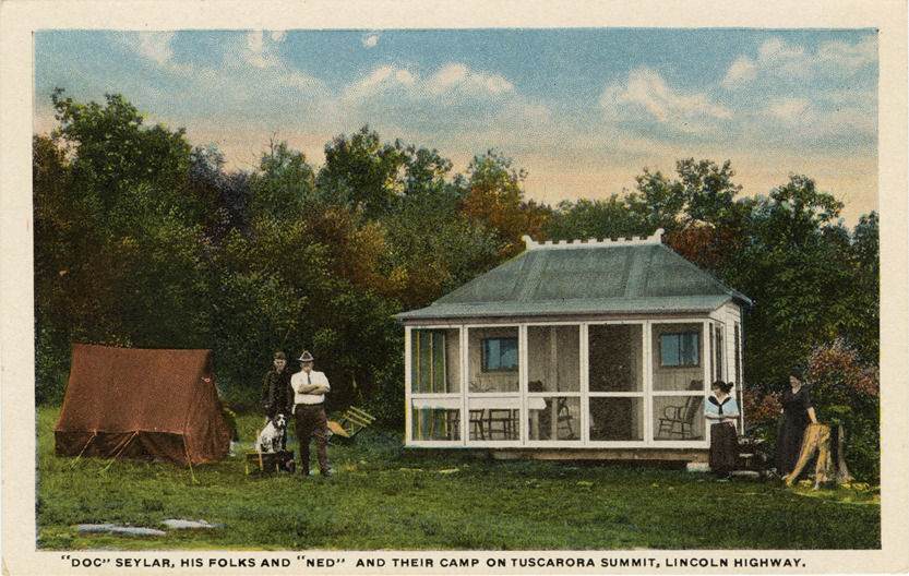 View of 'Doc' Seylar, family and dog at their camp on Tuscarora Summit, on the Lincoln Highway in Pennsylvania. Tent on left; wooden-frame dwelling with screened-in porch in background. Printed on front: "Doc Seylar, his folks and 'Ned' and their camp on Tuscarora Summit, Lincoln Highway." Printed on back: "Published by Leslie W. Seylar, McConnellsburg, Pa. Made in U.S.A. C.T. American Art."