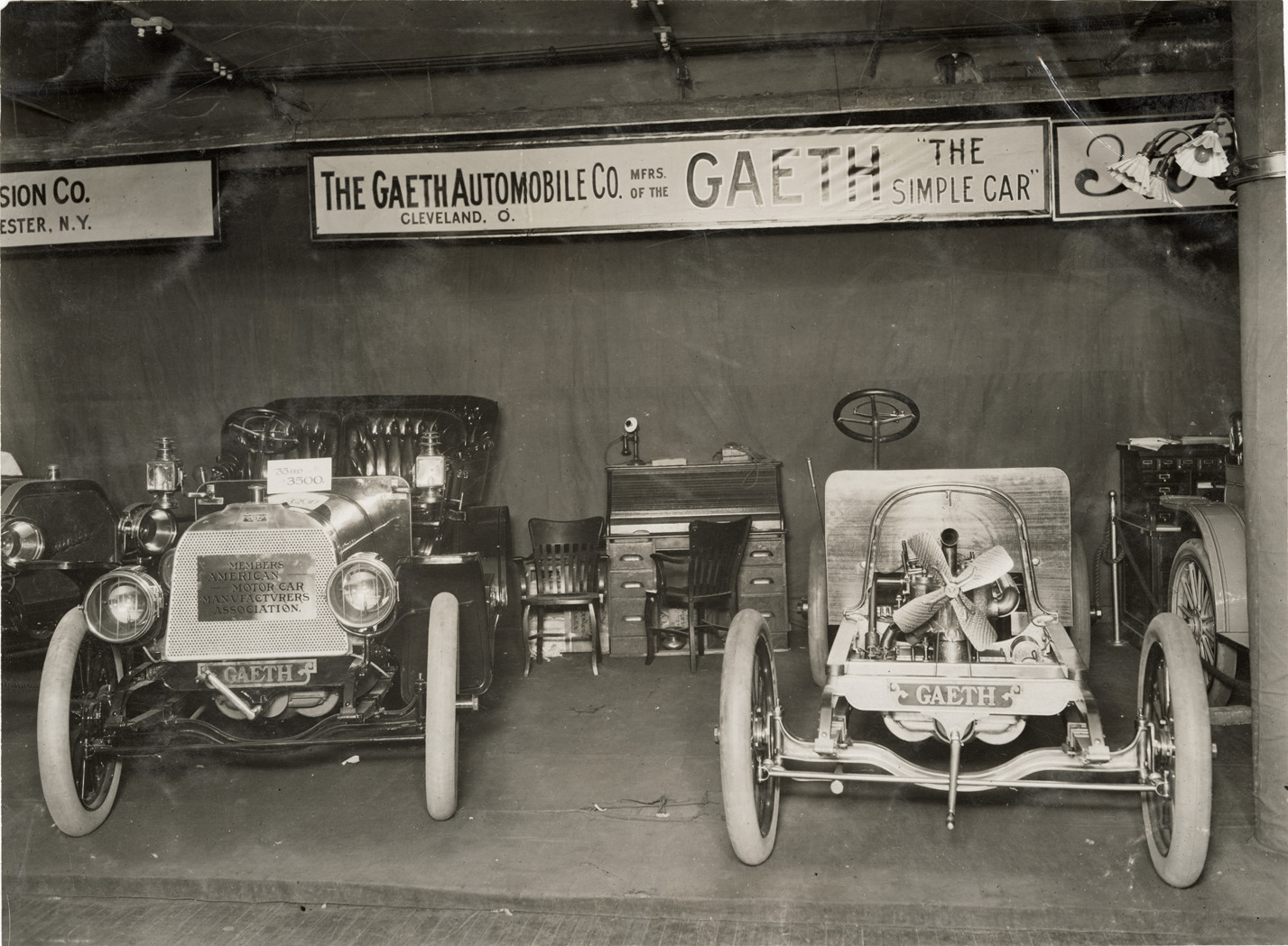 Favorite this☆ 1908 Gaeth automobile and chassis at trade show Description: View of 1908 Gaeth car and chassis on display at trade show. Sign over exhibit reads: "The Gaeth Automobile Co., Cleveland, O., mfrs. of the Gaeth, 'The simple car.'" Handwritten on back: "Gaeth, 1908." Details Resource ID: na044575 Subject: Automobiles Automobiles--Chassis Gaeth Motor Car Company Trade shows Photographic prints Date Issued: 1908 Format: 1 photographic print ; 7 x 9.5 in. Member of: National Automotive History Collection Lazarnick Collection Filing Location: General photograph files, Gaeth Rights: Physical rights are retained by DPL. Copyright is retained in accordance with U.S. copyright laws.