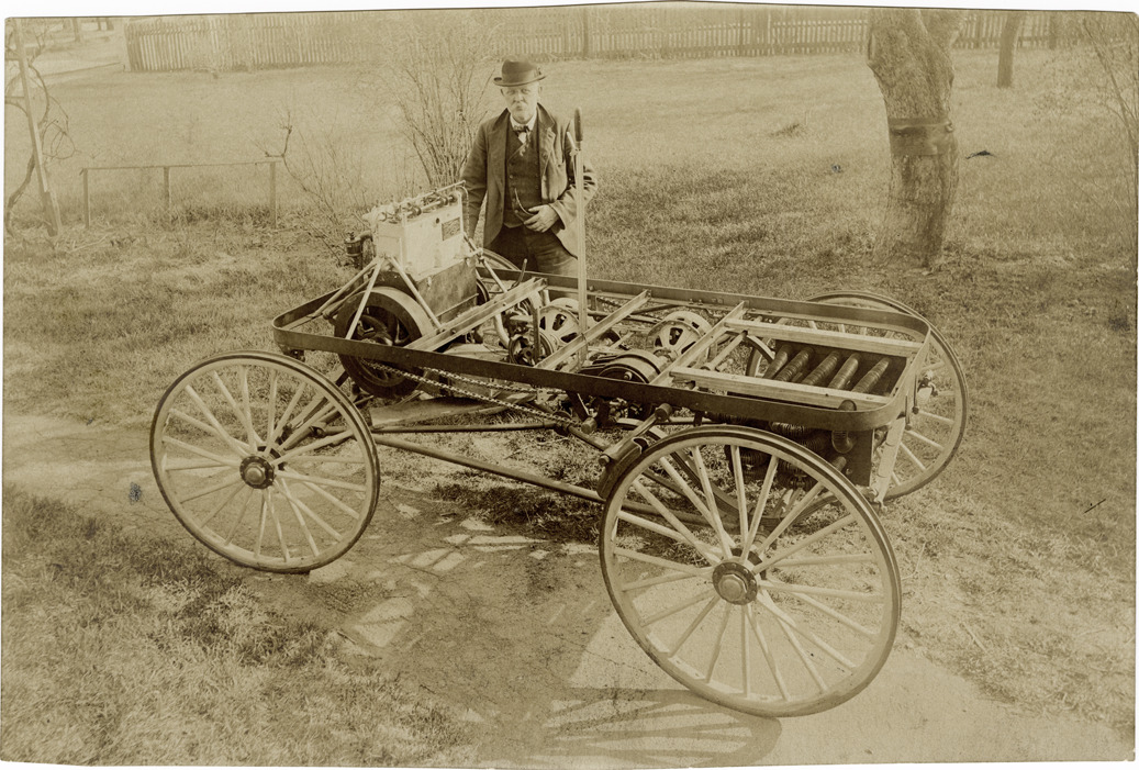 William H. Griffiths posing with Griffiths steam automobile chassis