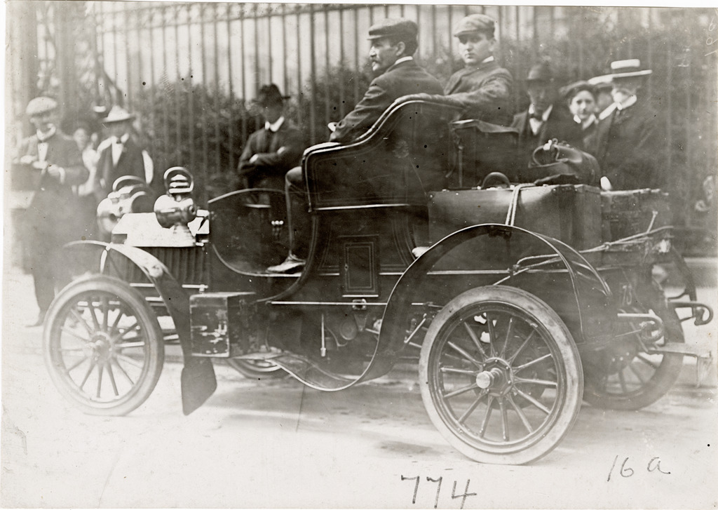 View of motorists posing in a 1904 Haynes-Apperson car. Handwritten on back: "Haynes-Apperson, 1904."