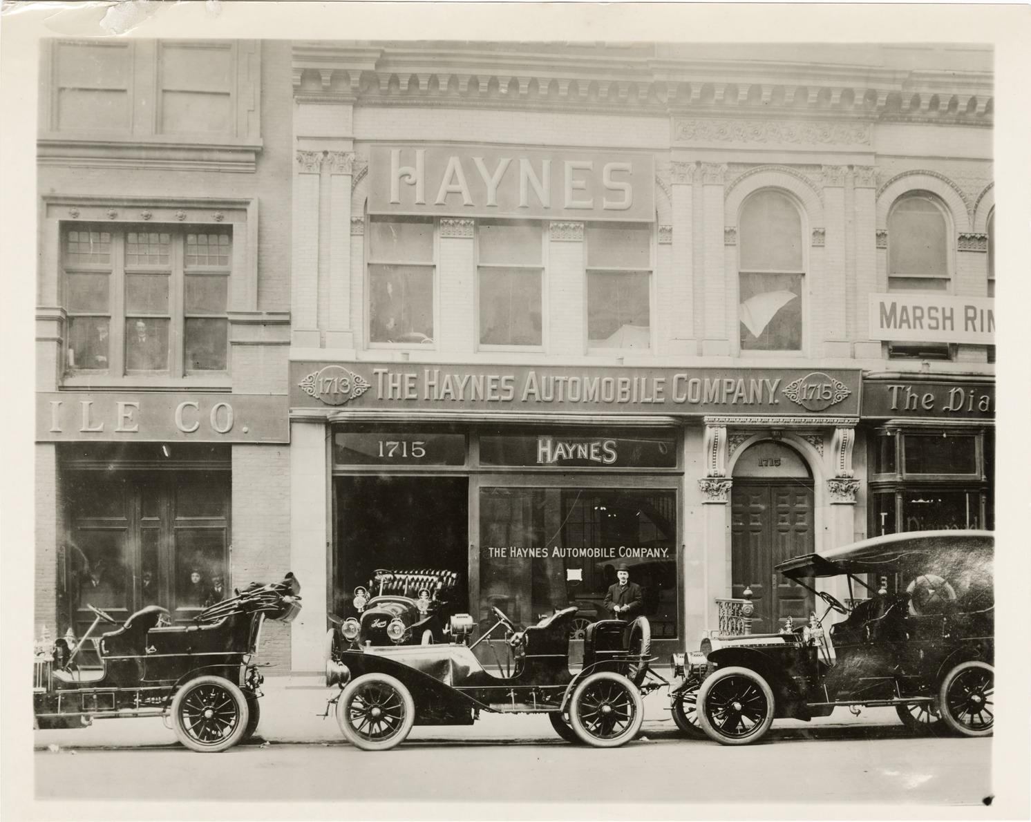 1907 Haynes automobiles parked in front of Haynes automobile dealership