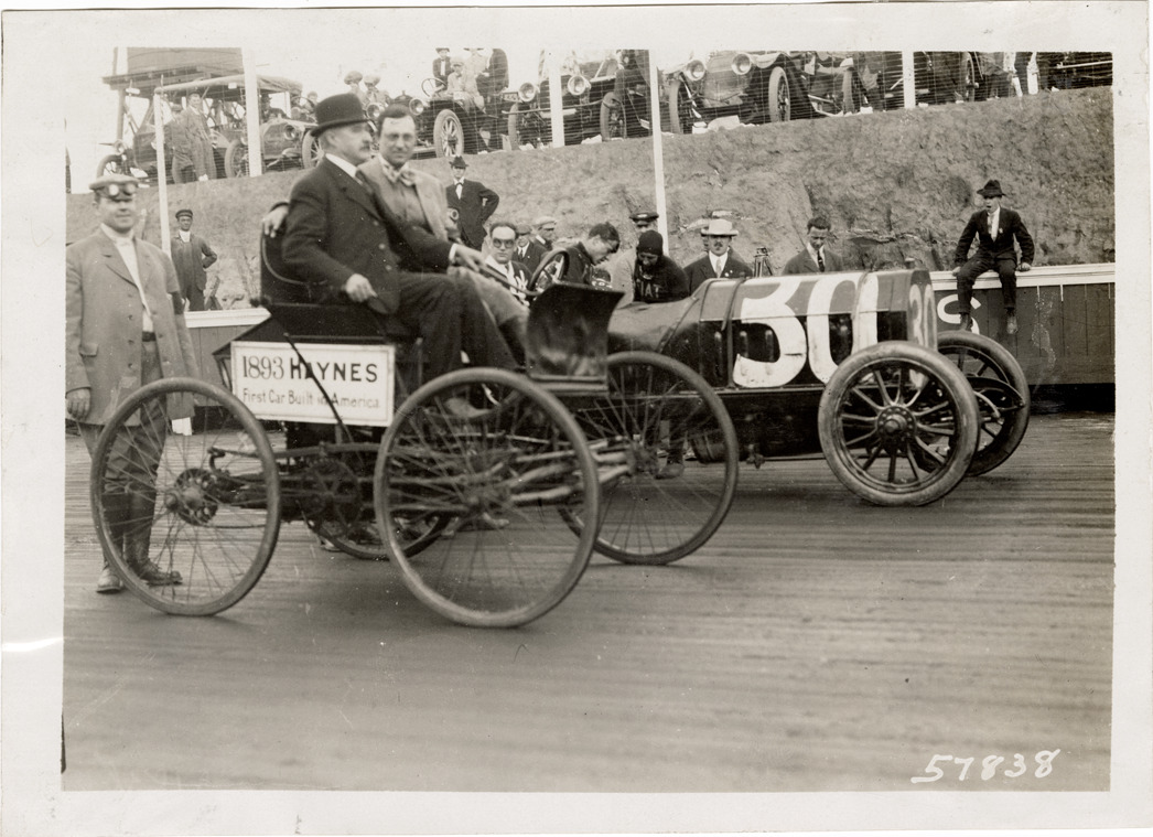 View of motorists posing in an 1893 Haynes car, next to racecar no. 30. Onlookers in background. Sign on car reads: "1893 Haynes, first car built in America." Stamped on back: "Spooner & Wells, Inc., photographers, telephones 3472-3473 Columbus, 1931 Broadway, New York." Handwritten on back: "Haynes, 1893. Prob. E. Haynes in bowler. Atlanta, 1909."