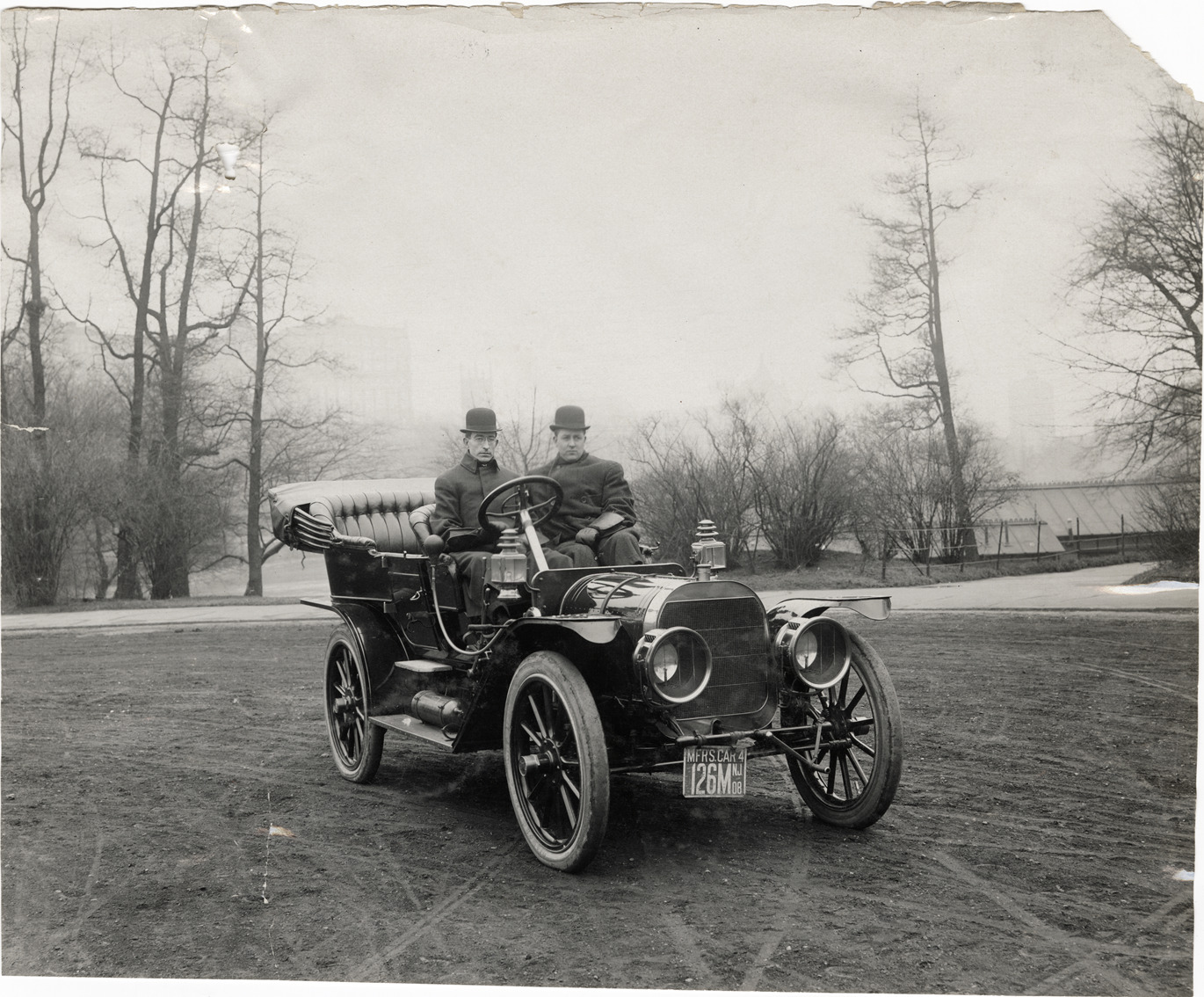 View of Frank Nutt and passenger posing in a Haynes car. Stamped on back: "Spooner & Wells, Inc., photographers, telephones 3472-3473 Columbus, 1931 Broadway, New York." Handwritten on back: "Haynes, ca. '09. Frank Nutt, dr."