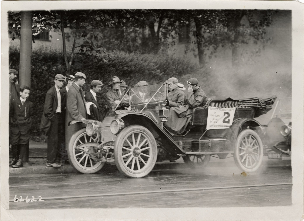 Driver and passenger in Haynes automobile, 1910 Brooklyn Dealers Reliability Run