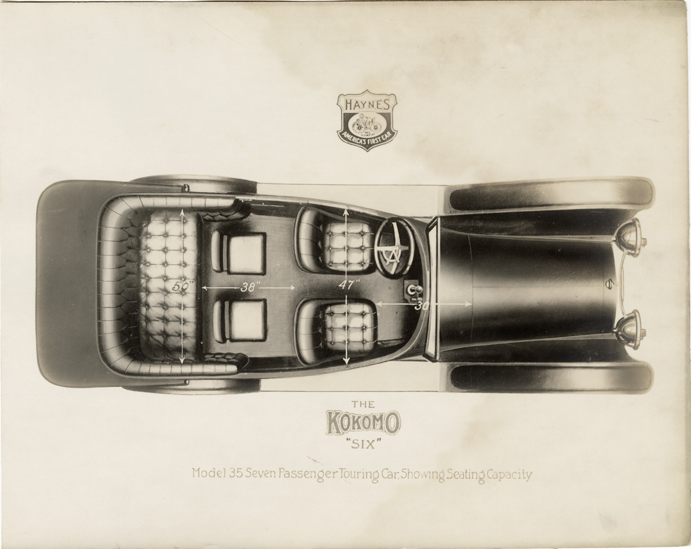 Favorite this☆ 1915 Haynes touring automobile Description: Overhead view, artist's depiction of a 1915 Haynes Model 35 touring car. Printed on front: "The Kokomo 'Six.' Model 35 seven passenger touring car, showing seating capacity." Handwritten on back: "Haynes, 1915." Details Resource ID: na044644 Subject: Haynes automobile Automobiles--Seats Photographic prints Date Issued: Unknown year Format: 1 photographic print mounted on fabric ; 7.5 x 9.5 in. Member of: National Automotive History Collection Filing Location: Haynes, 1915 Rights: Physical rights are retained by DPL. Copyright is retained in accordance with U.S. copyright laws.