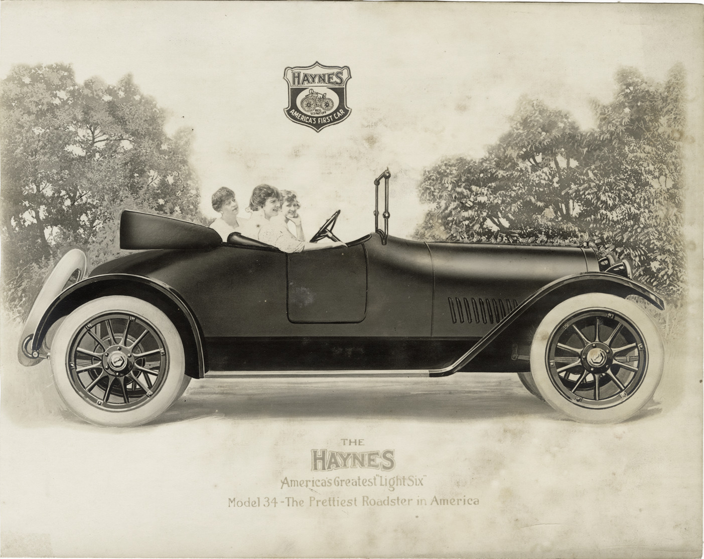 Favorite this☆ Women motorists posing in 1915 Haynes roadster Description: Artist's depiction of women motorists posing in a 1915 Haynes Model 34 roadster. Printed on front: "The Haynes, America's greatest 'Light Six.' Model 34, the prettiest roadster in America." Handwritten on back: "Haynes, 1915." Details Resource ID: na044646 Subject: Haynes automobile Women automobile drivers Photographic prints Date Issued: Unknown year Format: 1 photographic print mounted on fabric ; 7.5 x 9.5 in. Member of: National Automotive History Collection Filing Location: Haynes, 1915 Rights: Physical rights are retained by DPL. Copyright is retained in accordance with U.S. copyright laws.