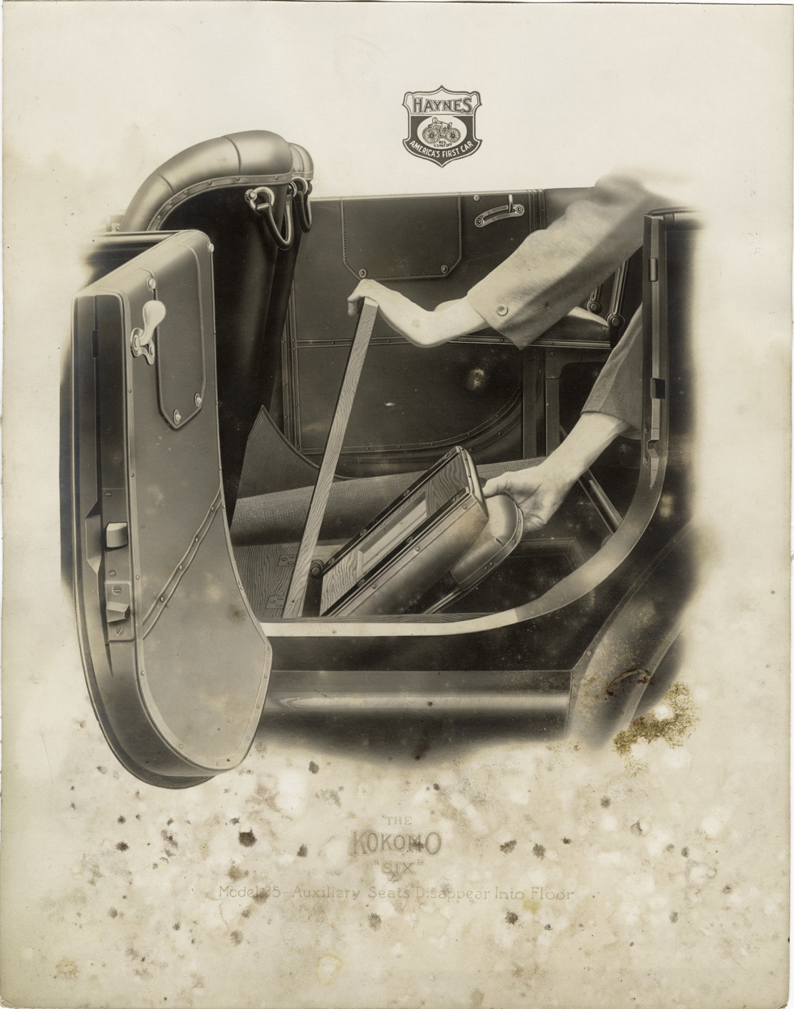 Favorite this☆ Auxiliary seats, 1915 Haynes automobile Description: Artist's depiction of auxiliary seats in a 1915 Haynes Model 35 car. Printed on front: "The Kokomo 'Six.' Model 35, auxiliary seats disappear into floor." Handwritten on back: "Haynes, 1915." Details Resource ID: na044648 Subject: Haynes automobile Automobiles--Seats Photographic prints Date Issued: Unknown year Format: 1 photographic print mounted on fabric ; 9.5 x 7.5 in. Member of: National Automotive History Collection Filing Location: Haynes, 1915 Rights: Physical rights are retained by DPL. Copyright is retained in accordance with U.S. copyright laws.