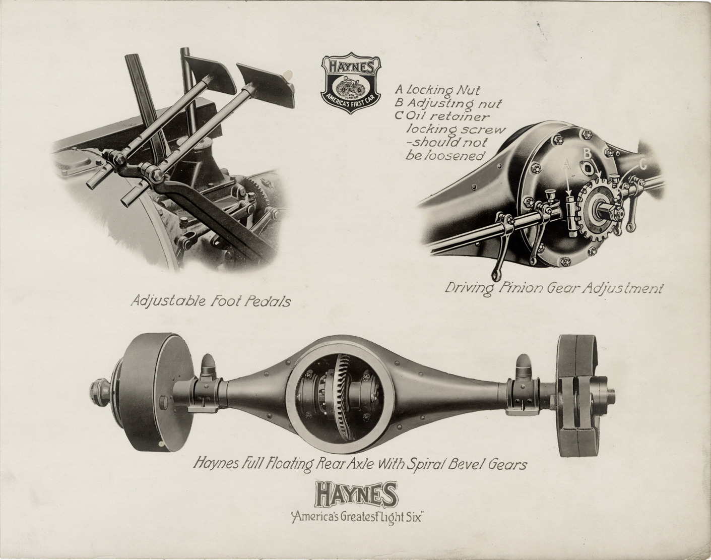 Artist's depiction of foot pedals, driving pinion gears and rear axle for a Haynes car. Printed on front: "Adjustable foot pedals. Driving pinion gear adjustment. A. Locking nut. B. Adjusting nut. C. Oil retainer locking screw, should not be loosened. Haynes full floating rear axle with spiral bevel gears. Haynes, America's greatest 'light six.'" Handwritten on back: "Haynes, ca. 1916."