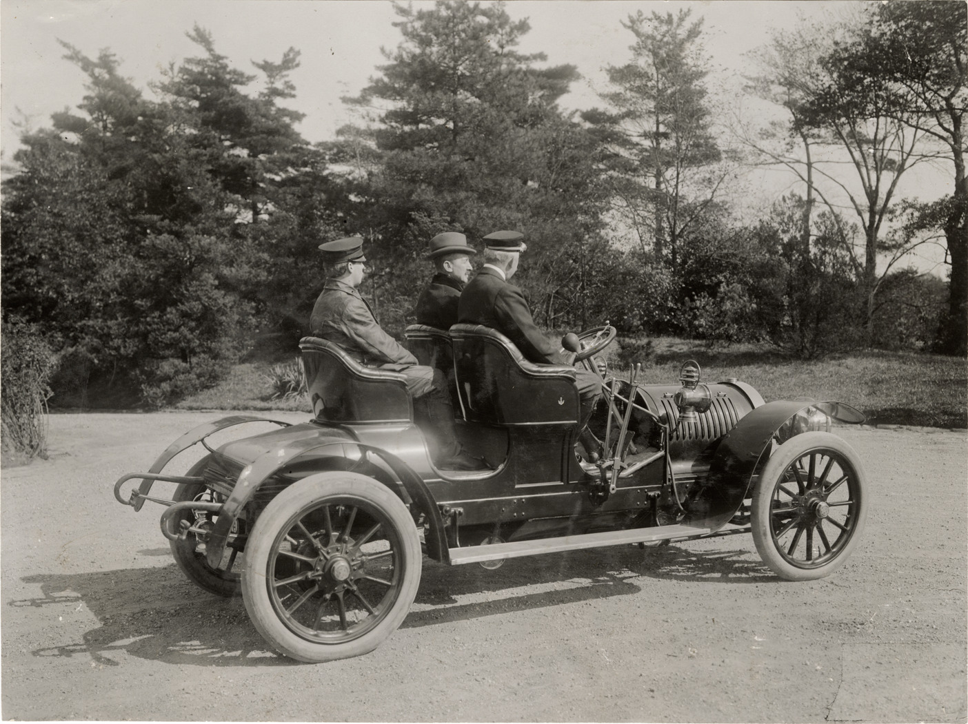 View of motorists posing in a Hotchkiss car. Handwritten on back: "Hotchkiss, ca. 1906."