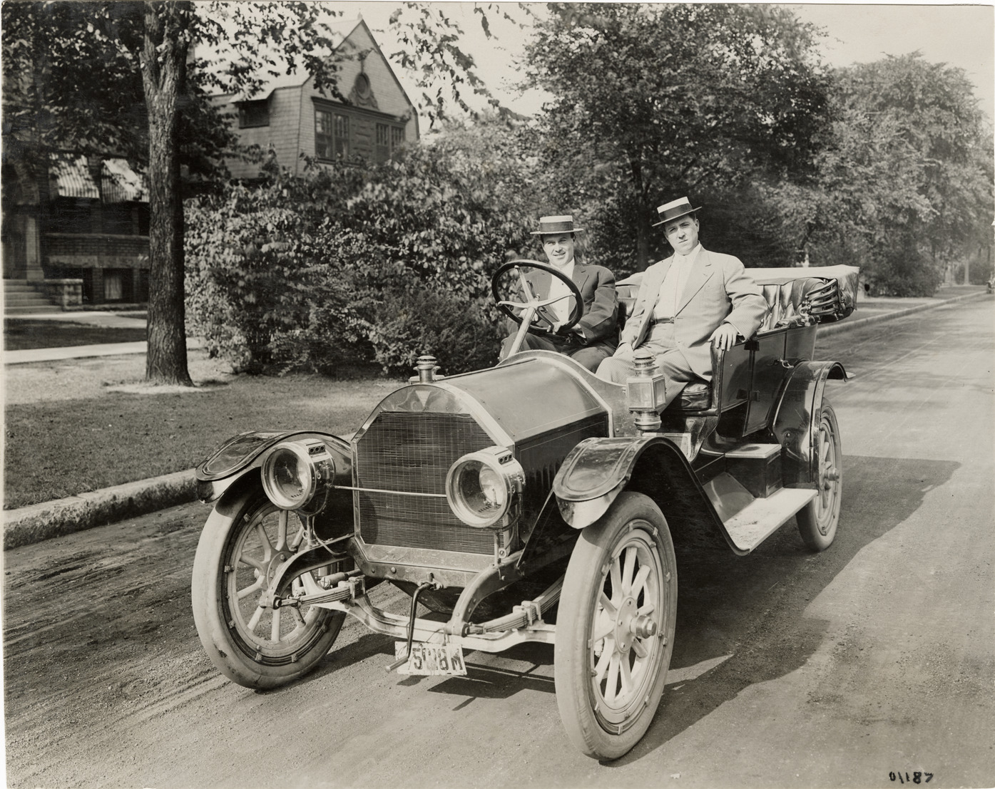 View of motorists posing in a 1910 Hudson touring car. Stamped on back: "Spooner & Wells, Inc., photographers, telephone North 1745. 1231 Woodward Ave., Detroit, Mich. Detroit, 1231 Woodward, New York, 1931 Broadway." Handwritten on back: "Hudson, 1910 touring car."