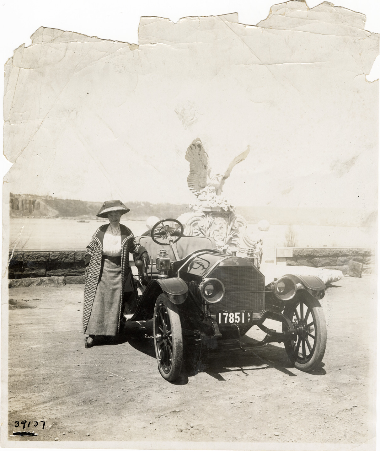View of woman motorist posing with Hudson Model 20 roadster. Eagle sculpture in background. Stamped on back: "Spooner & Wells, Inc., photographers, telephones 3472-3473 Columbus, 1931 Broadway, New York." Handwritten on back: "Hudson, ca. 1910, (Model 20) roadster."