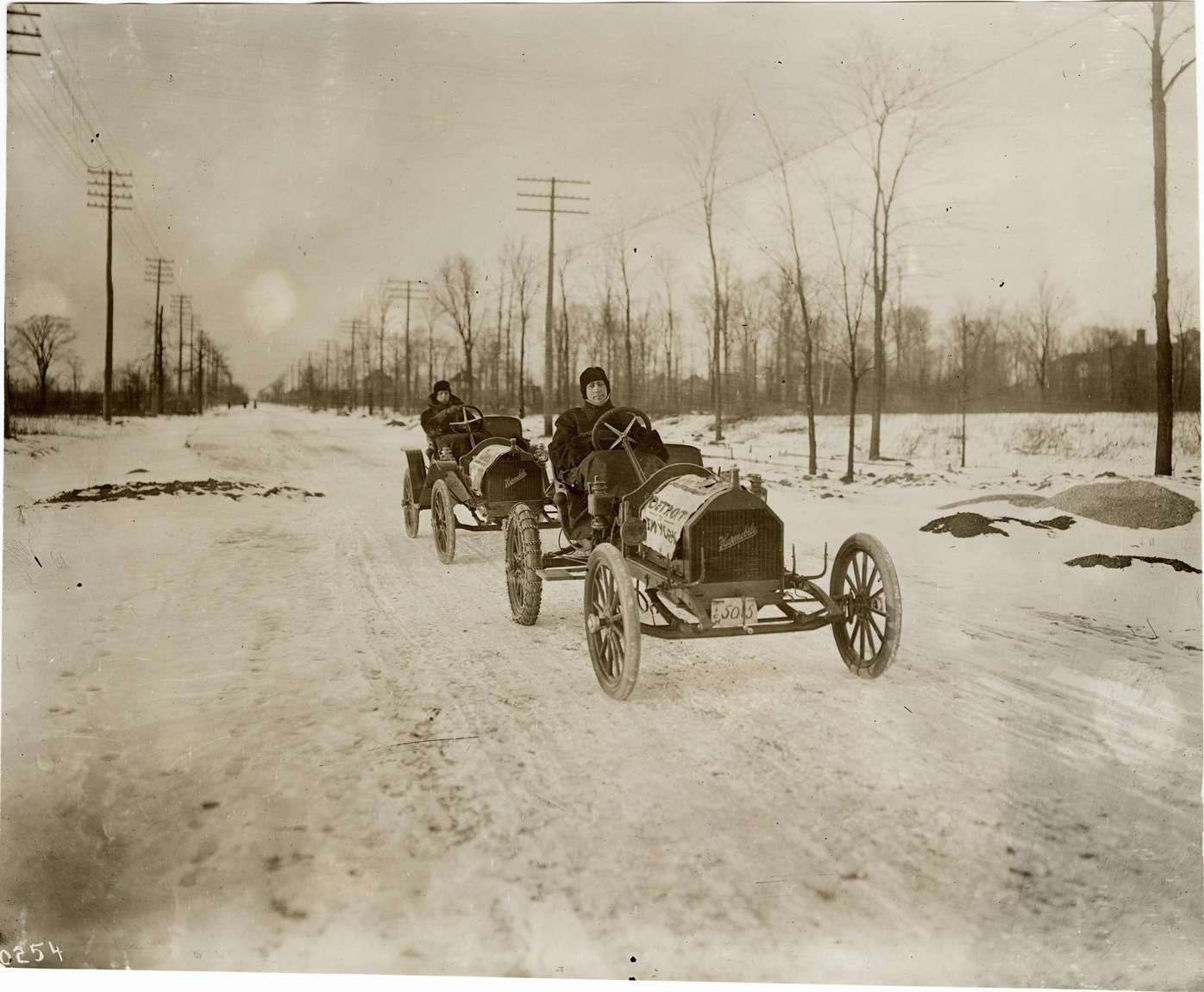 Drivers posing in Hupmobile racecars during winter Description: View of drivers posing in two Hupmobile cars on snow-covered rural road. Handwritten on back: "Hupmobile, ca. 1910." Details Resource ID: na044757 Subject: Hupp automobile Automobiles, Racing Automobile driving in winter Photographic prints Date Issued: Unknown year Format: 1 photographic print ; 7.75 x 9.25 in. Member of: National Automotive History Collection Lazarnick Collection Filing Location: General photograph files, Hupmobile, 1909-1910 Rights: Physical rights are retained by DPL. Copyright is retained in accordance with U.S. copyright laws.