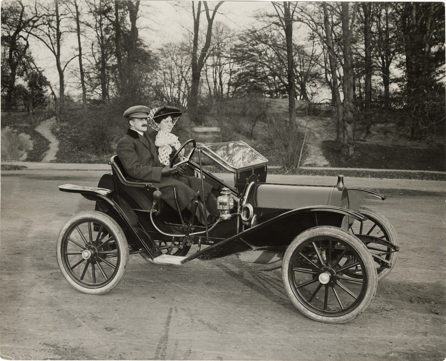 View of a man and woman posing in a Hupmobile car. Stamped on back: "Spooner & Wells, Inc., photographers, telephones 3472-3473 Columbus, 1931 Broadway, New York." Handwritten on back: "Hupmobile, app. 1910."