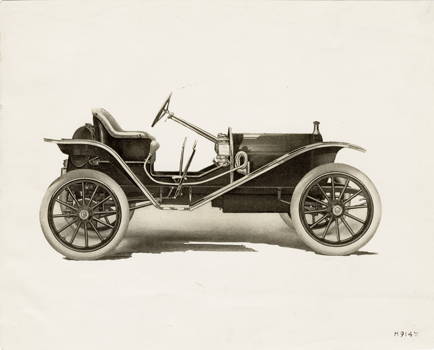 Artist's depiction of a 1909 Hupmobile car. Stamped on back: "Copies by Commercial photography, Jeffery White Studio, Inc. 410 Marquette Bldg., Detroit, Mich." Handwritten on back: "Hupmobile, 1909. Hupp Motor Car Corp. See letter Hupp M.C. to D. Beecroft, Oct. 13, 1924 & enclosures in Hupmobile (Beecroft Coll.)."