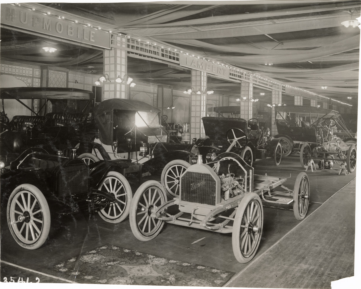 View of 1910 Hupmobile cars and chassis on display at trade show. "Hupmobile" sign over exhibit on left. Lambert exhibit in background. Stamped on back: "Spooner & Wells, Inc., photographers, telephones 3472-3473 Columbus, 1931 Broadway, New York." Handwritten on back: "Hupmobile, 1910."