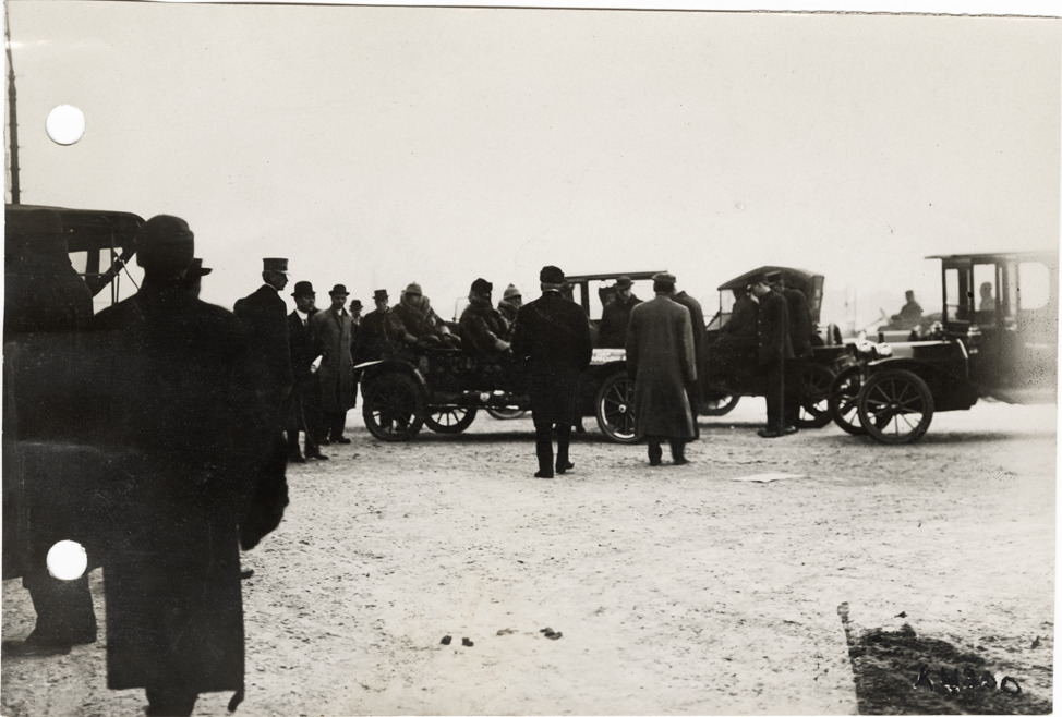 View of Hupmobile car arriving in Detroit during the Hupmobile World Tour. Stamped on back: "Spooner & Wells, Inc., photographers, 1231 Woodward Ave., Detroit, Mich., telephone North 1745." Handwritten on back: "Arrival of world touring Hupmobile at Detroit. Hupmobile, ca. 1911."