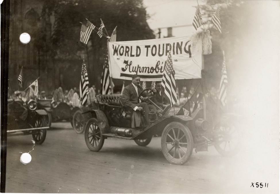 View of motorists in world touring Hupmobilecar in parade during Cadillaqua celebration in Detroit, Michigan. Car is decorated with American flags and a "World touring Hupmobile" banner. Stamped on back: "Spooner & Wells, Inc., photographers, 1231 Woodward Ave., Detroit, Mich., telephone North 1745." Handwritten on back: "Cadillaqua celebration, Detroit, 1912."