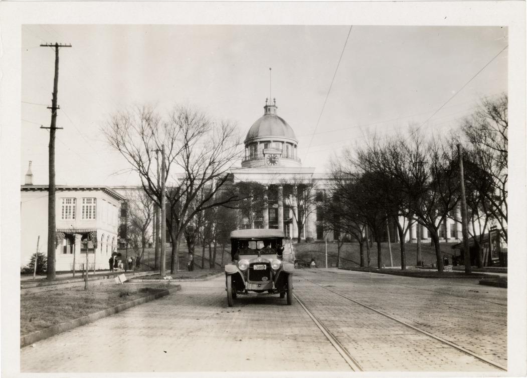 View of Hupmobile car parked in front of Alabama state capitol building at Montgomery, Alabama during the Hupmobile United American Tour. The tour was also known as the Hupmobile Capital-to-Capital tour. Stamped on back: "Photo by N. Lazarnick, automobile photographer, 246 W. 42nd St., N.Y." Handwritten on back: "Montgomery, Ala. Hupmobile, ca. 1917."
