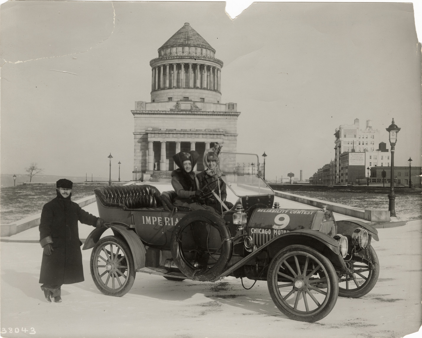View of women motorists posing in a 1911 Imperial car in front of Grant's Tomb, New York. Man poses next to car; Imperial, 1000 Mile Reliability Contest, 9, Chicago Motor [Club]" is painted on car. Stamped on back: "Spooner & Wells, Inc., photographers, telephones 3472-3473 Columbus, 1931 Broadway, New York." Handwritten on back: "Imperial, 1911."