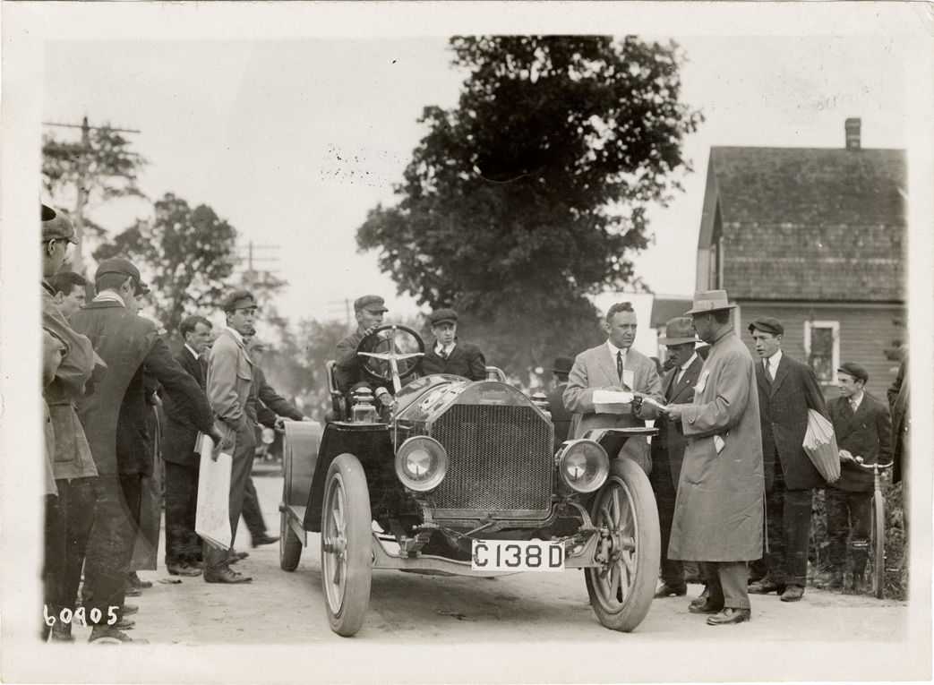 View of motorists, officials and onlookers with an Inter-State car. Stamped on back: "Spooner & Wells, Inc., photographers, telephones 3472-3473 Columbus, 1931 Broadway, New York." Handwritten on back: "Inter-State, ca. 1910."