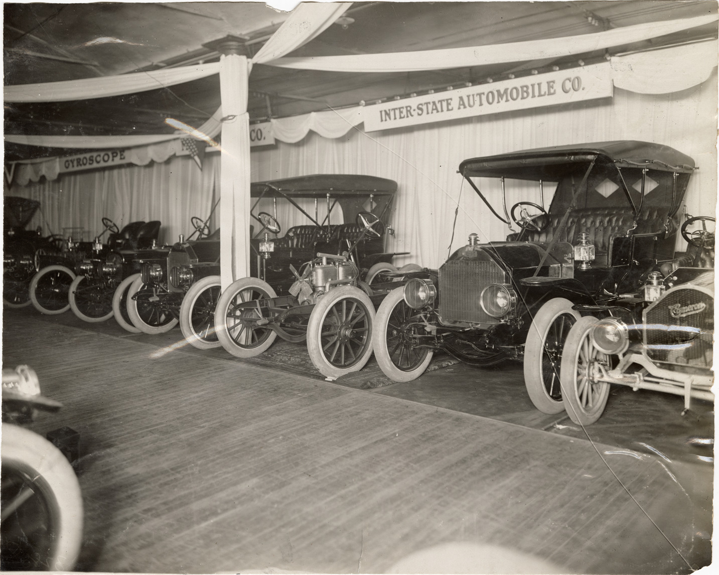 View of 1909 Inter-State cars and chassis on display at trade show. "Inter-State Automobile Co." sign in background. Stamped on back: "Spooner & Wells, Inc., photographers, telephones 3472-3473 Columbus, 1931 Broadway, New York." Handwritten on back: "Inter-State, 1909."
