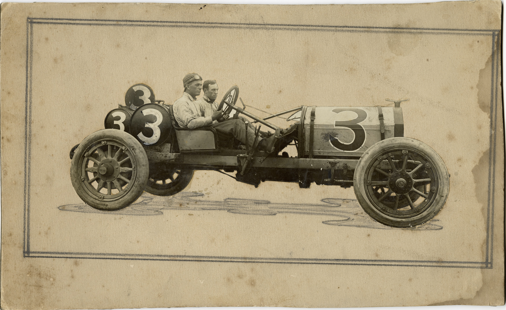 View of driver and passenger in Inter-State car no. 3. Handwritten on back: "Inter-State, ca. 1909."