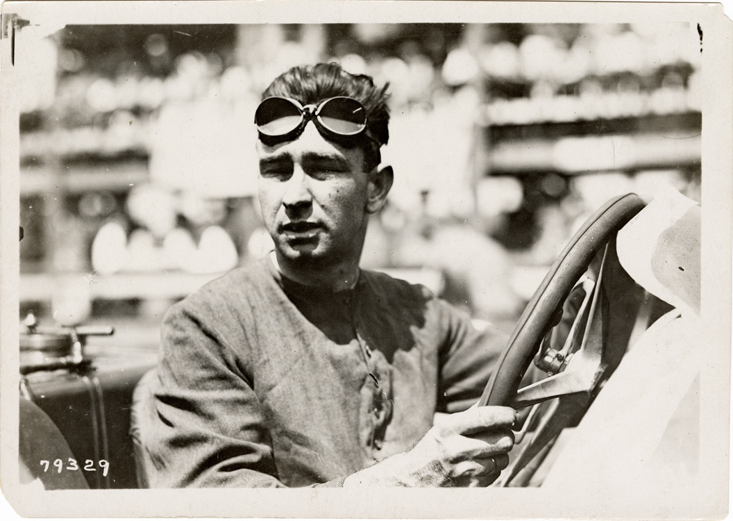 Close-up view of Bob Burman in a Keeton car during 1913 Elgin National Trophy Race. Stamped on back: "Spooner & Wells, Inc., photographers, 1931 Broadway, N.Y. City, phones 3472-3473 Col." Handwritten on back: "Burman, Elgin, 1913. Keeton."