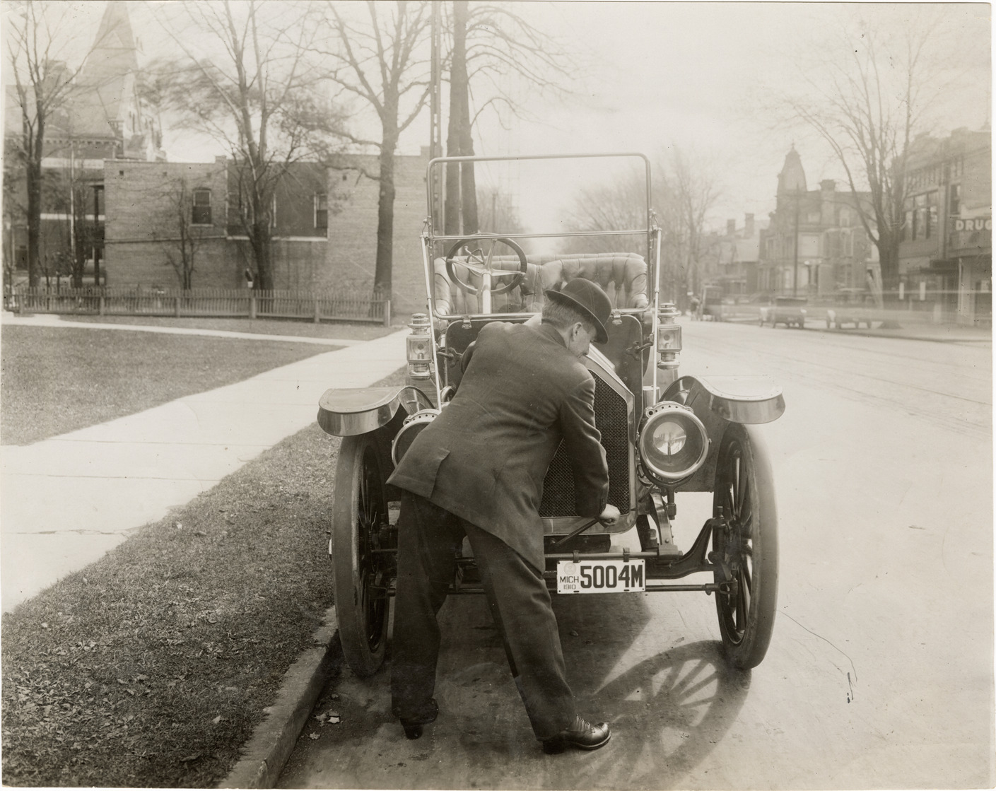 Motorist starting a King automobile