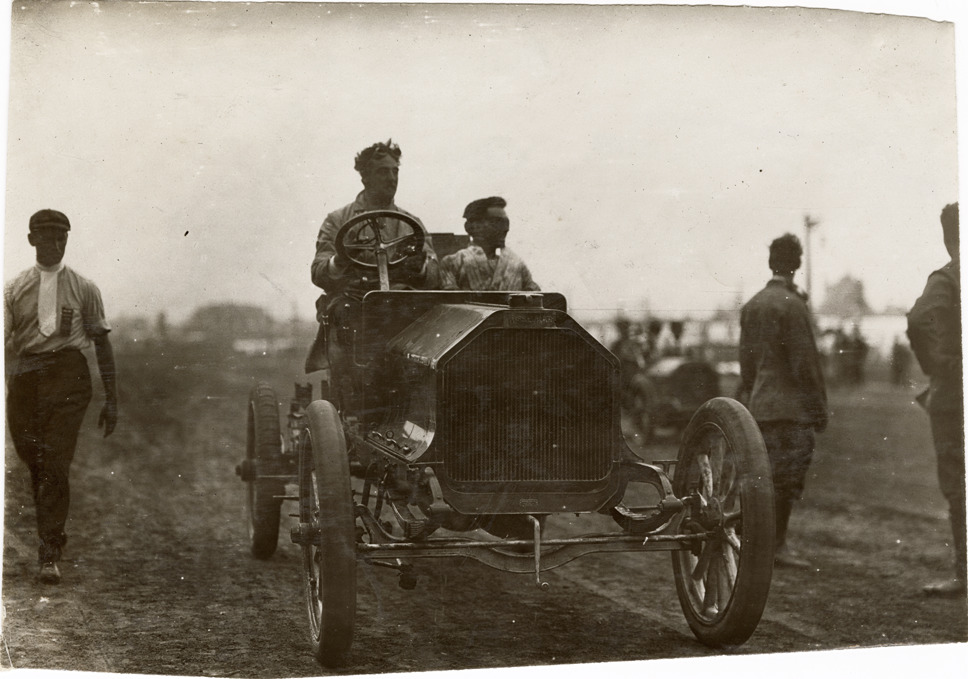 Driver and passenger in Kissel Kar racecar, 1909 Brighton Beach races