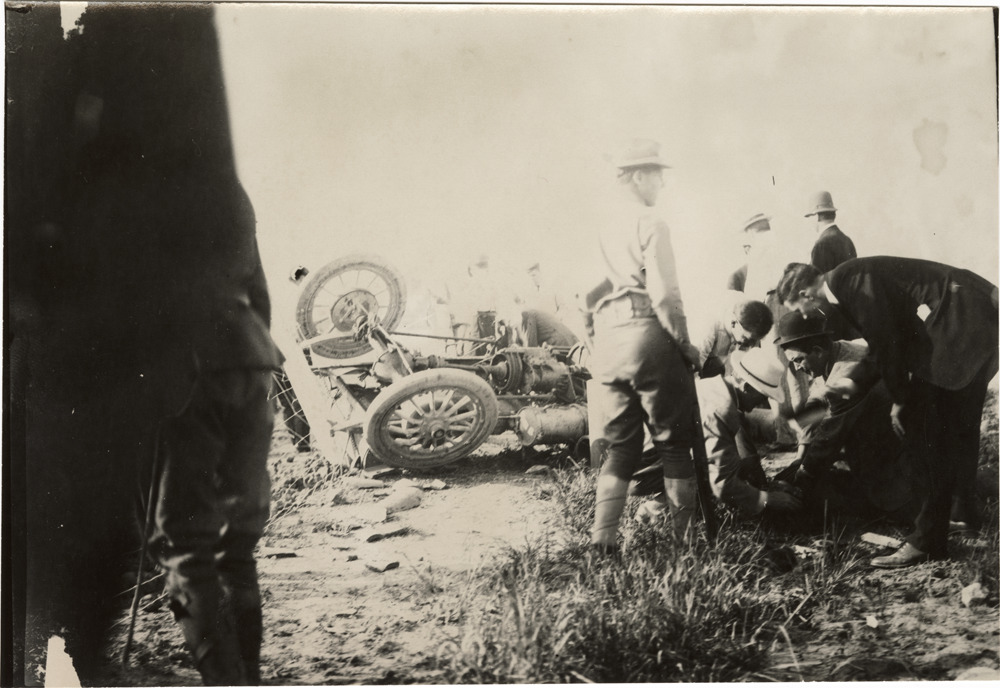 View of overturned Knox racecar as a result of accident during the 1909 races at the Indianapolis Speedway in Indiana. Men tend to the accident victim, driver William Bourque, in foreground. Handwritten on back: "Bourque, Knox, Indianapolis, 1909. Knox racer, 1909."