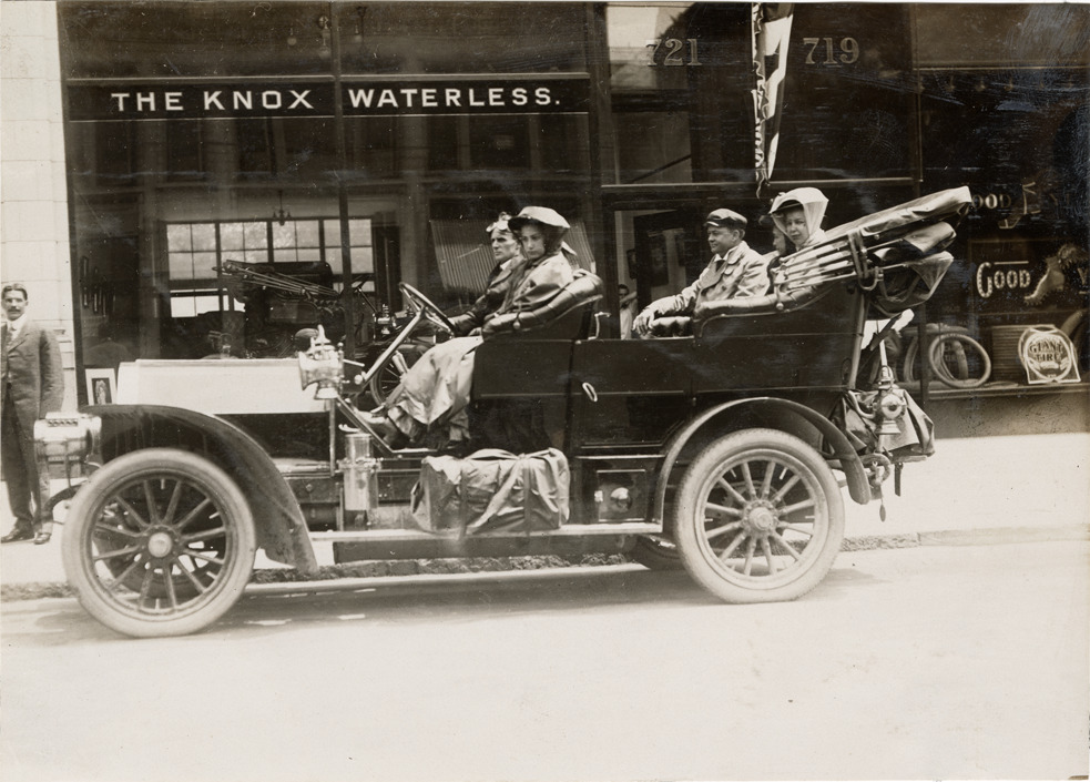 Favorite this☆ Motorists in Knox automobile, 1906 Glidden Tour Description: View of driver and passengers in Knox car during the 1906 Glidden Tour. Dealership with "Knox waterless" sign in background. Handwritten on back: "Knox, 1906 Glidden Tour." Details Resource ID: na045004 Subject: Automobiles Knox Automobile Company Glidden Tour (1906) Automobile driving--Competitions Photographic prints Date Issued: 1906-07 Format: 1 photographic print ; 4.75 x 6.5 in. Member of: National Automotive History Collection Lazarnick Collection Filing Location: General photograph files, Knox Rights: Physical rights are retained by DPL. Copyright is retained in accordance with U.S. copyright laws.