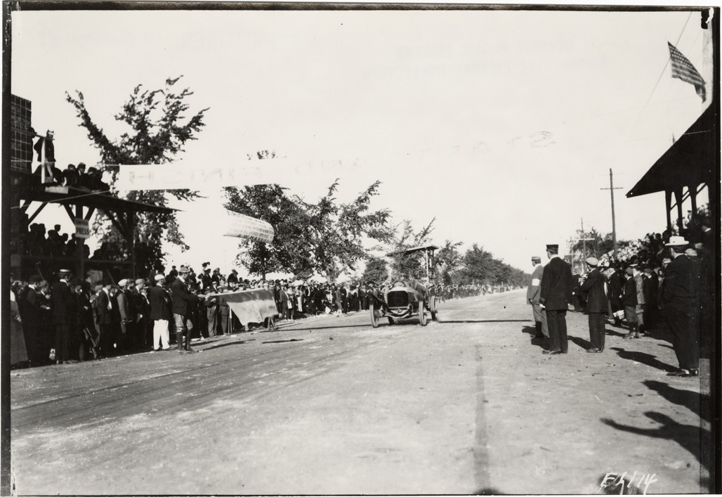 View of William Bourque and passenger racing Knox car no. 6 past spectators during the 1908 Lowell road race in Lowell, Massachusetts. Handwritten on back: "Bourque, Knox, Lowell, 1908. Knox, '08."