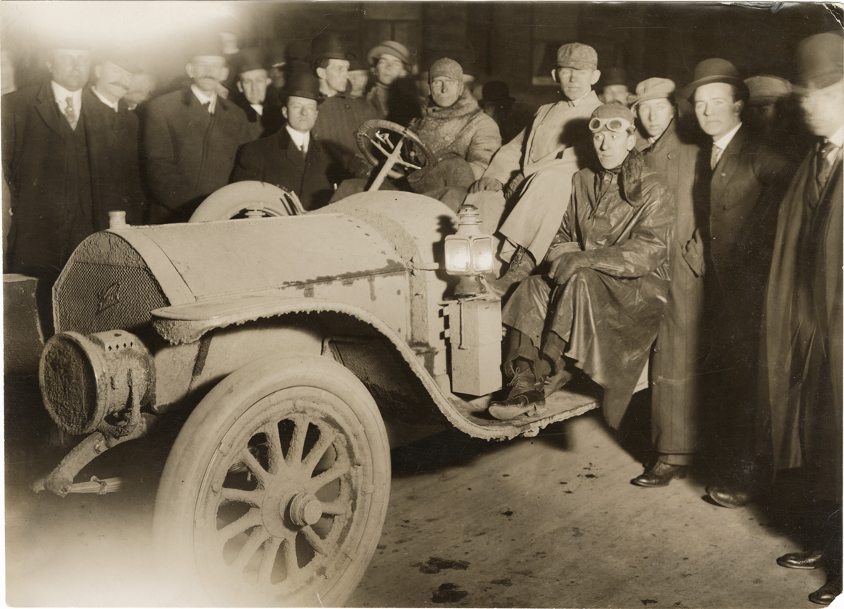 Nighttime view of motorists and onlookers posing with Knox car. Stamped on back: "Photo by N. Lazarnick, 29 West 42nd Street, N.Y., tel. 594 Bryant." Handwritten on back: "Knox, perfect score at finish. Knox, ca. 1909."