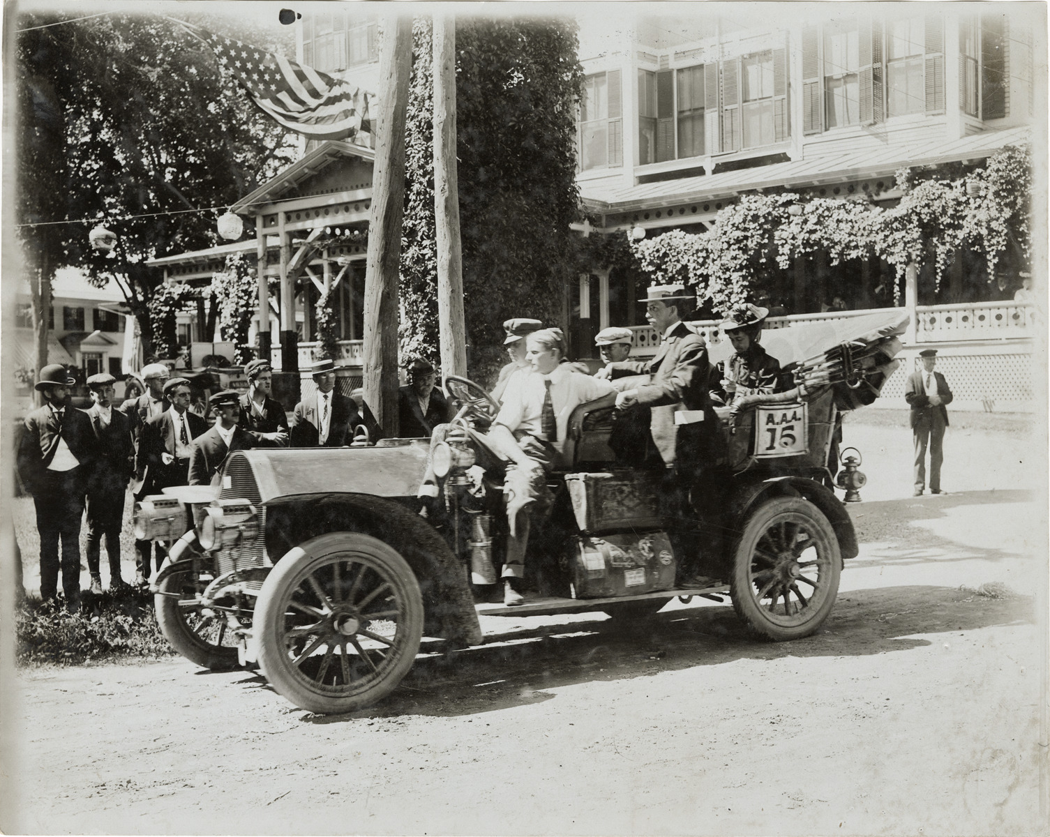 View of motorists posing in Knox car no. 15 during the 1906 Glidden Tour. Stamped on back: "F. Ed. Spooner, and Chas. S. Wells. Motor News, Motor Photos, Motor Adv, 1536 B'way, New York. Tel 6536-38th St." Handwritten on back: "Knox, 1906. Glidden."
