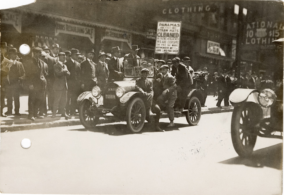 View of men posing with a Krit car during a streetcar strike. Group of men wait on sidewalk; commercial buildings in background. Handwritten on back: "Taken during street car strike, May 13 & 14, 1915."