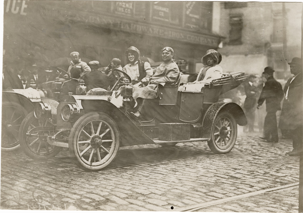 View of Harry Fosdick and passengers posing in a Lancia car at Albany, New York. Stamped on back: "Spooner & Wells, Inc., photographers, telephones 3472-3473 Columbus, 1931 Broadway, New York." Handwritten on back: "Harry Fosdick in Lancia at Albany. Lancia, ca.'09."