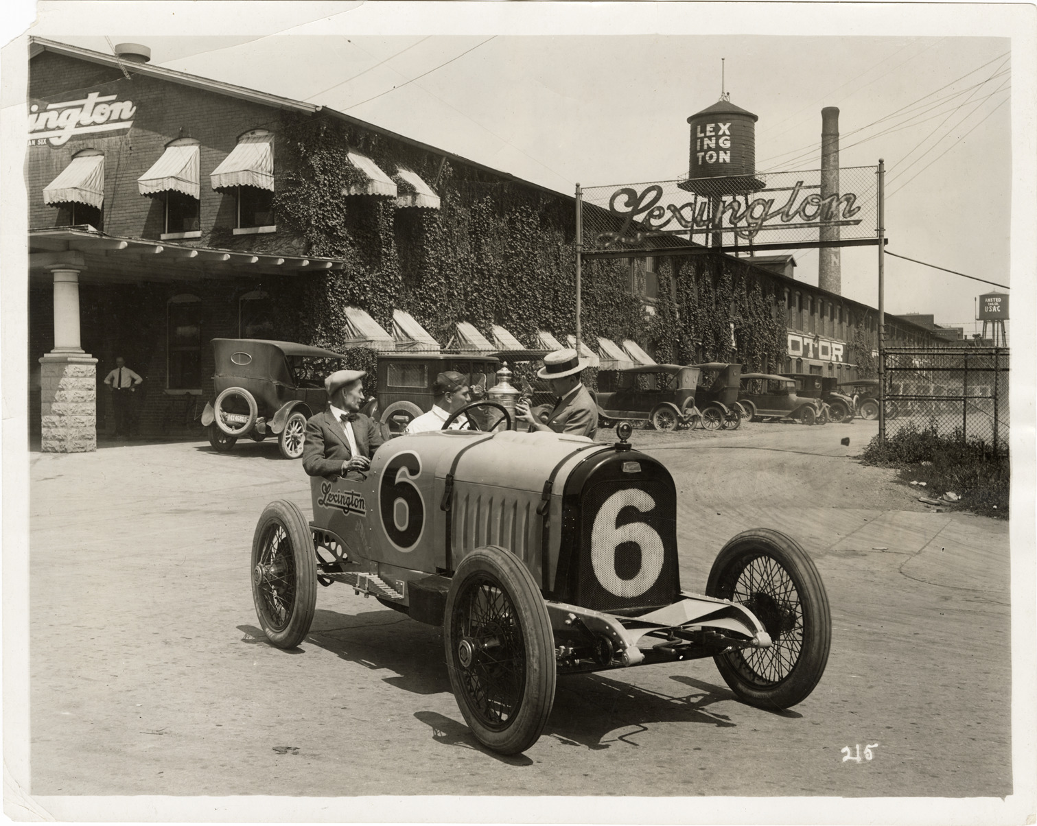 View of Al Cline and John C. Moore in a 1922 Lexington car no. 6. Frank B. Ansted, president of the Lexington Motors Company holds the Penrose Trophy. "Lexington" wire sign and water tower in background. Label on back: "Frank B. Ansted, president of the Lexington Motor Company, telling Al Cline, at the wheel of number 6, that the Penrose Trophy 'must come back.' The smile on John C. Moore's face, chief engineer for Lexington, seated at Cline's right, indicates that he does not regard the repetition of last year's double victory as too difficult next September 5. Cline was less than six seconds behind his team mate, Ot Loesche, who won the free-for-all event in the Pike's Peak hill climb and the Penrose Trophy." Handwritten on back: "Lexington, 1922."