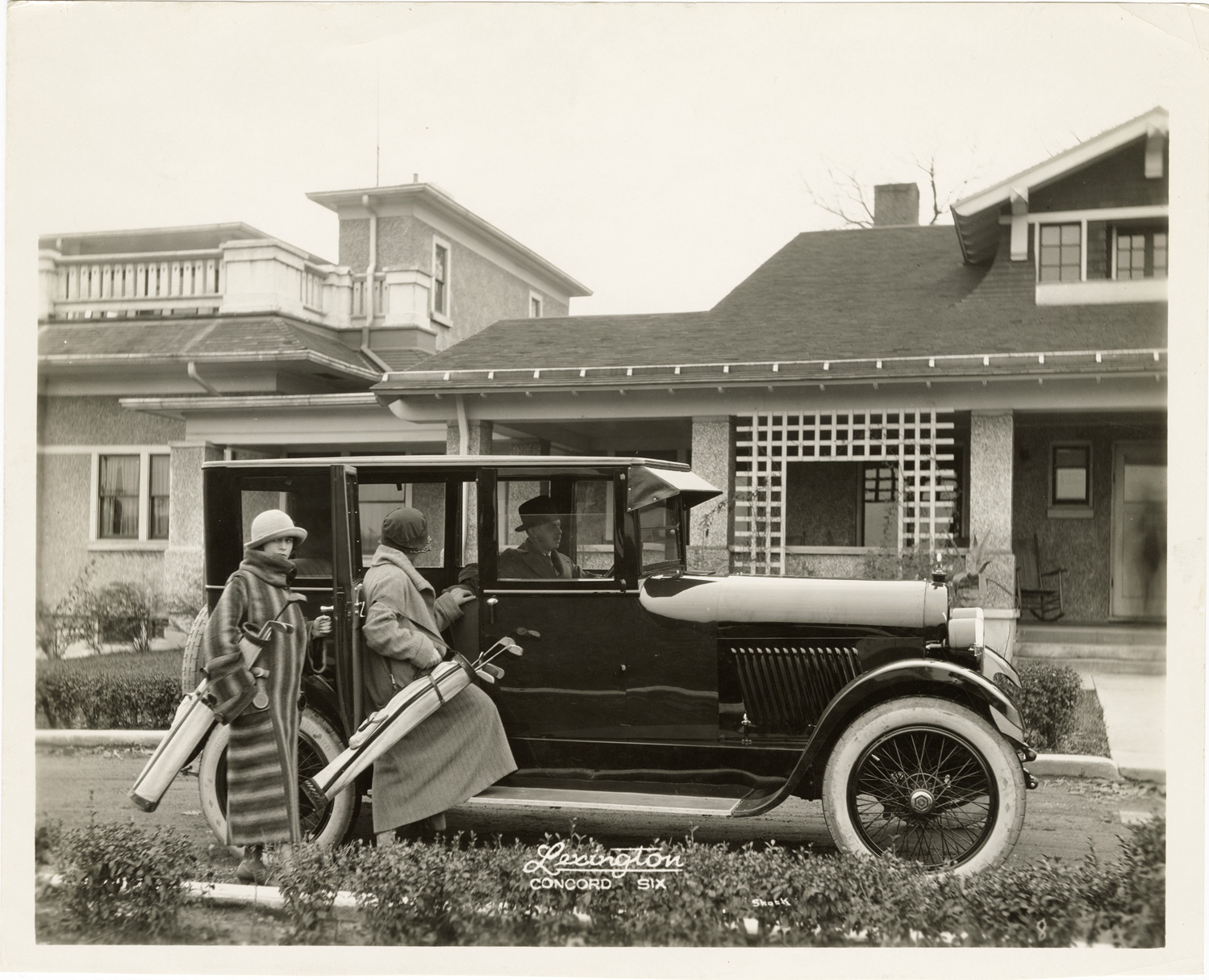 View of women golfers, holding golf clubs and posing with a 1924 Lexington Concord Six. House in background. Printed on front: "Lexington Concord Six. Shook." Handwritten on back: "1924 Lexington."