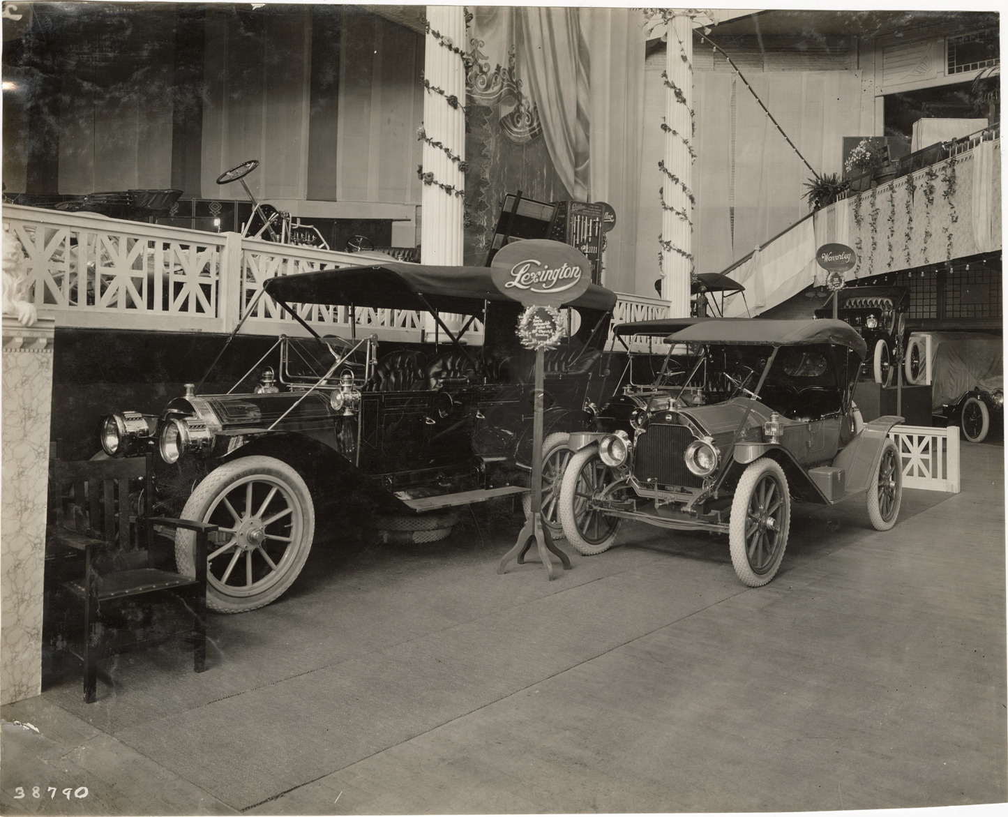 View of 1912 Lexington cars on display at trade show. "Lexington. The Davis Automobile Co., 87 Church St., Boston" sign in exhibt. Stamped on back: "Spooner & Wells, Inc., photographers, telephones 3472-3473 Columbus, 1931 Broadway, New York." Handwritten on back: "Lexington, 1912."