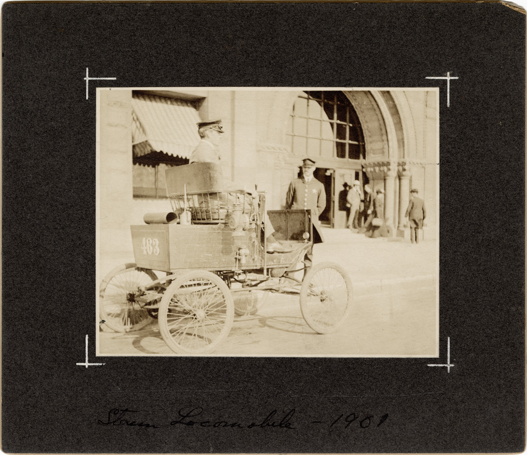 View of motorist in a 1901 Locomobile steam car in front of the Congress Hotel in Chicago, Illinois. Handwritten on front: "Steam Locomobile, 1901." Handwritten on back: "A steam Locomobile standing in front of Congress Hotel, Michigan Ave., Chicago in [undecipherable]."