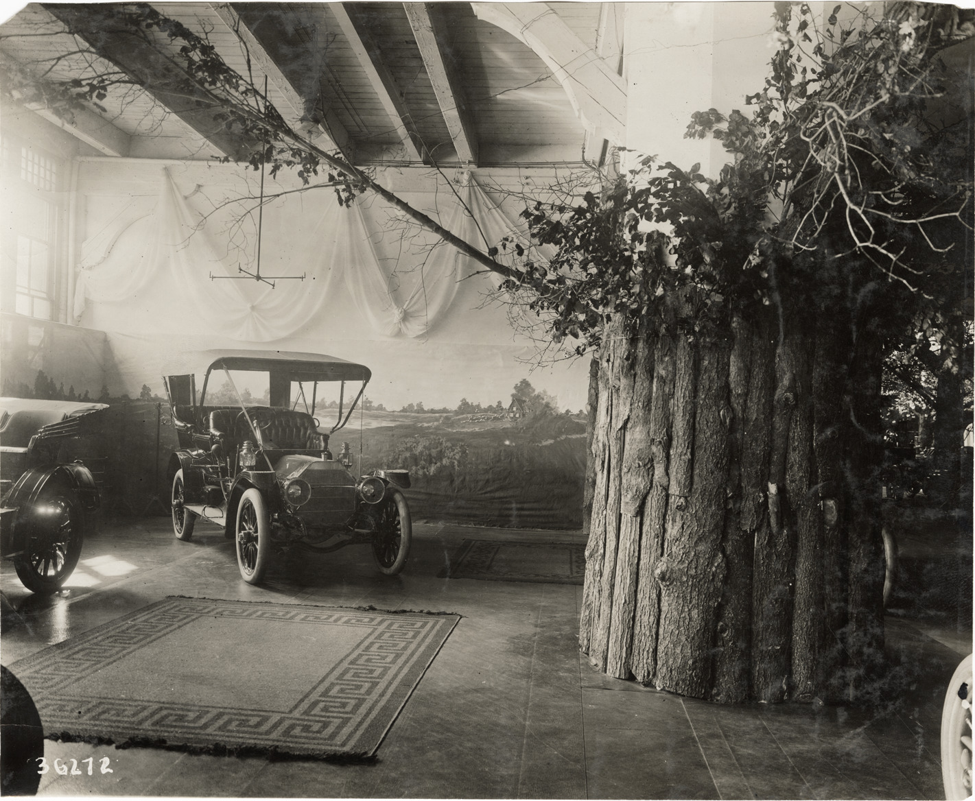 View of a 1909-1910 Locomobile "30" car in a showroom or trade show. Artificial tree on right; scenic panorama in background. Stamped on back: "Spooner & Wells, Inc., photographers, telephones 3472-3473 Columbus, 1931 Broadway, New York." Handwritten on back: "1909/10 Locomobile "30", 4 cy., h.p., 5-p. touring car with cape top. Photograph by Spooner & Wells, 1931 Broadway, N.Y.C."