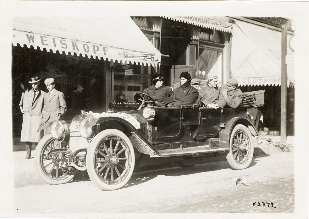 View of Jack Banta and officials in 1911 Locomobile "48" touring car at Kenosha, Wisconsin. Stamped on back: "Spooner & Wells, Inc., photographers, telephone North 1745. 1231 Woodward Ave., Detroit, Mich. Detroit, 1231 Woodward, New York, 1931 Broadway." Handwritten on back: "Jack Banta & officials in 1911 72 hp Loco at Kenosha. 1911 Locomobile '48', 6 cy., 72 h.p., 5-p. touring car. Photograph by Spooner & Wells. Detroit office: 1231 Woodward Ave."