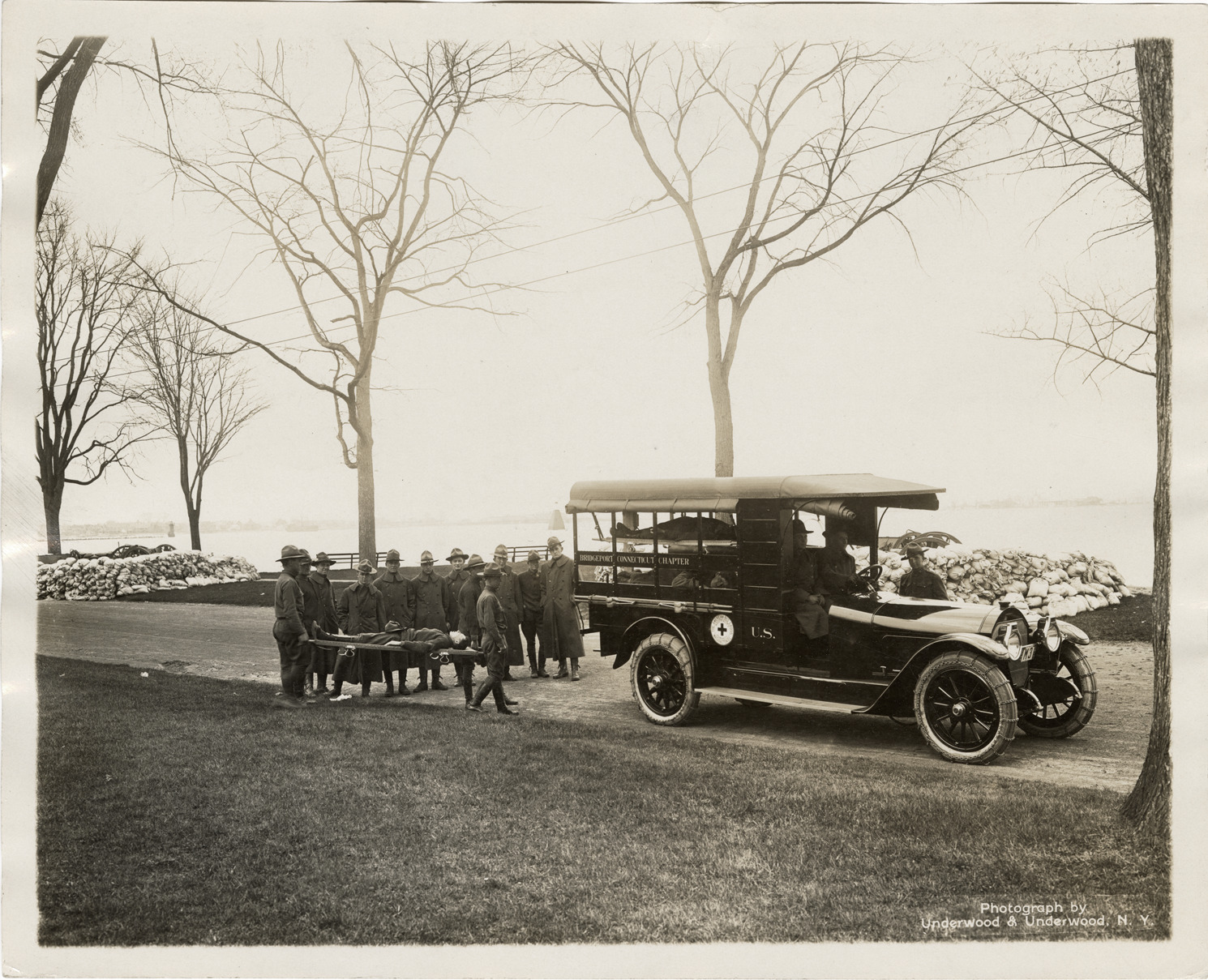 View of soldiers posing with 1917-1918 Locomobile ambulance for the Bridgeport, Connecticut American Red Cross. Soldier on stretcher on left. Printed on front: "Photograph by Underwood & Underwood, N.Y." Typed on back: "Somewhere in Connecticut. The latest government design in motor ambulance bodies mounted upon a Locomobile chassis, presented to the Bridgeport Connecticut Chapter of the American Red Cross by Mr. Walter B. Lashar of Bridgeport." Handwritten on back: "1917/8 Locomobile, 6 cy., special ambulance body. Photograph by Underwood & Underwood, New York."