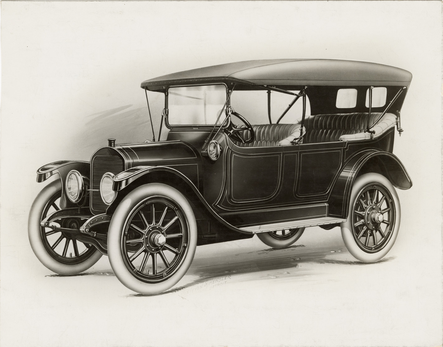Artist's depiction of a 1913 Lozier car. Stamped on back: "Oliver E. Barthel, mechanical designing, 302 Moffat Bldg., Detroit, Mich." Handwritten on back: "Lozier, 1913."