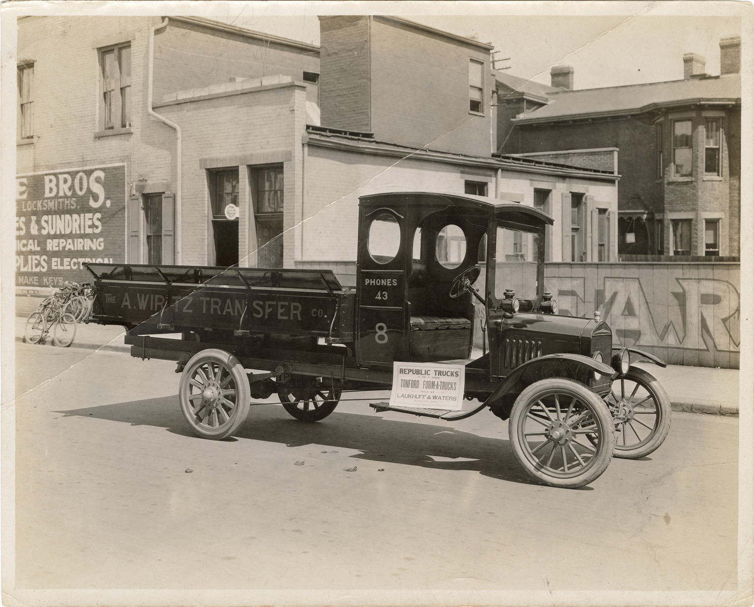 View of a Republic truck owned by the A. Wirtz Transfer Co. in Hamilton, Ohio. "A. Wirtz Transfer Co., 8, phones 43" painted on truck. Sign on truck reads: "Republic trucks, 1 to 5 tons. Tonford form-a-trucks sold by Laukhuff & Waters, Hamilton, Ohio." Handwritten on back: "Hamilton, Ohio. Republic trucks, c.1915."