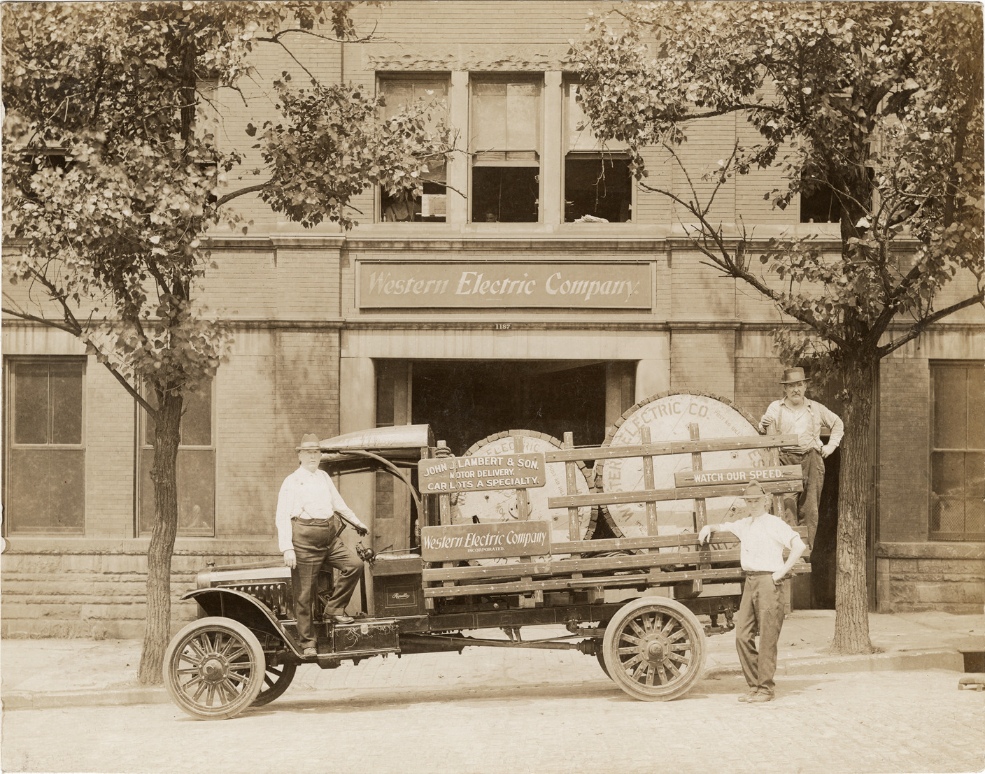 View of three men posing with a Republic truck owned by the Western Electric Company. Signs on truck read: "John J. Lambert & Son, motor delivery, car lots a specialty," Western Electric Company, Incorporated" and "Watch our speed." Western Electric Company sign displayed on building in background. Stamped on back: "W.C. Wright & Co., commercial photographers. Phone Canal 3006, No. 19 Opera Place, Cincinnati, Ohio."