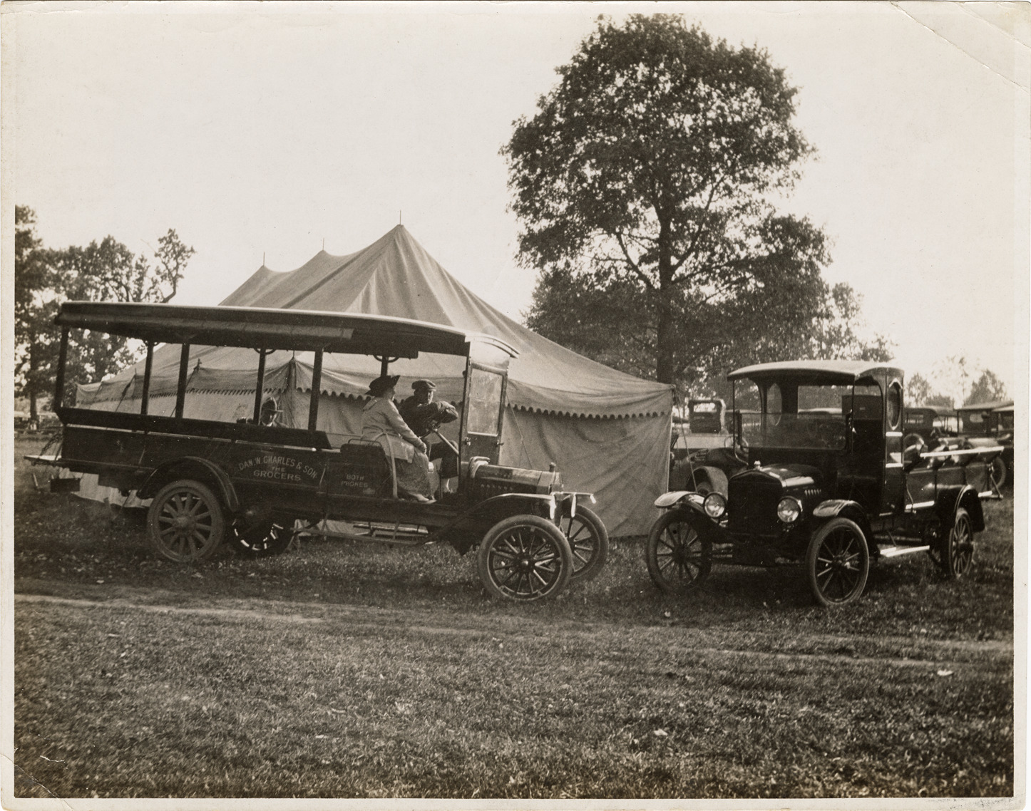 View of two trucks parked in front of tents during an outdoor exhibit. "Dan W. Charles & Son, the grocers" is painted on side of truck on left. Handwritten on back: "Trucks, modified, c.1920."